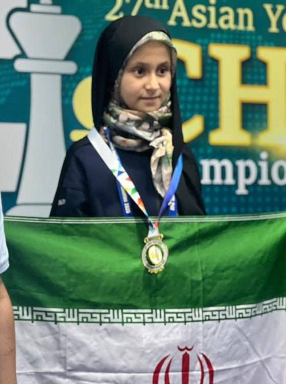 اسما حسن پور در سکوی نائب قهرمانی آسیا با پوشش چادر و پرچم ایران، ۲۰۲۵م، بانکوک تایلند.